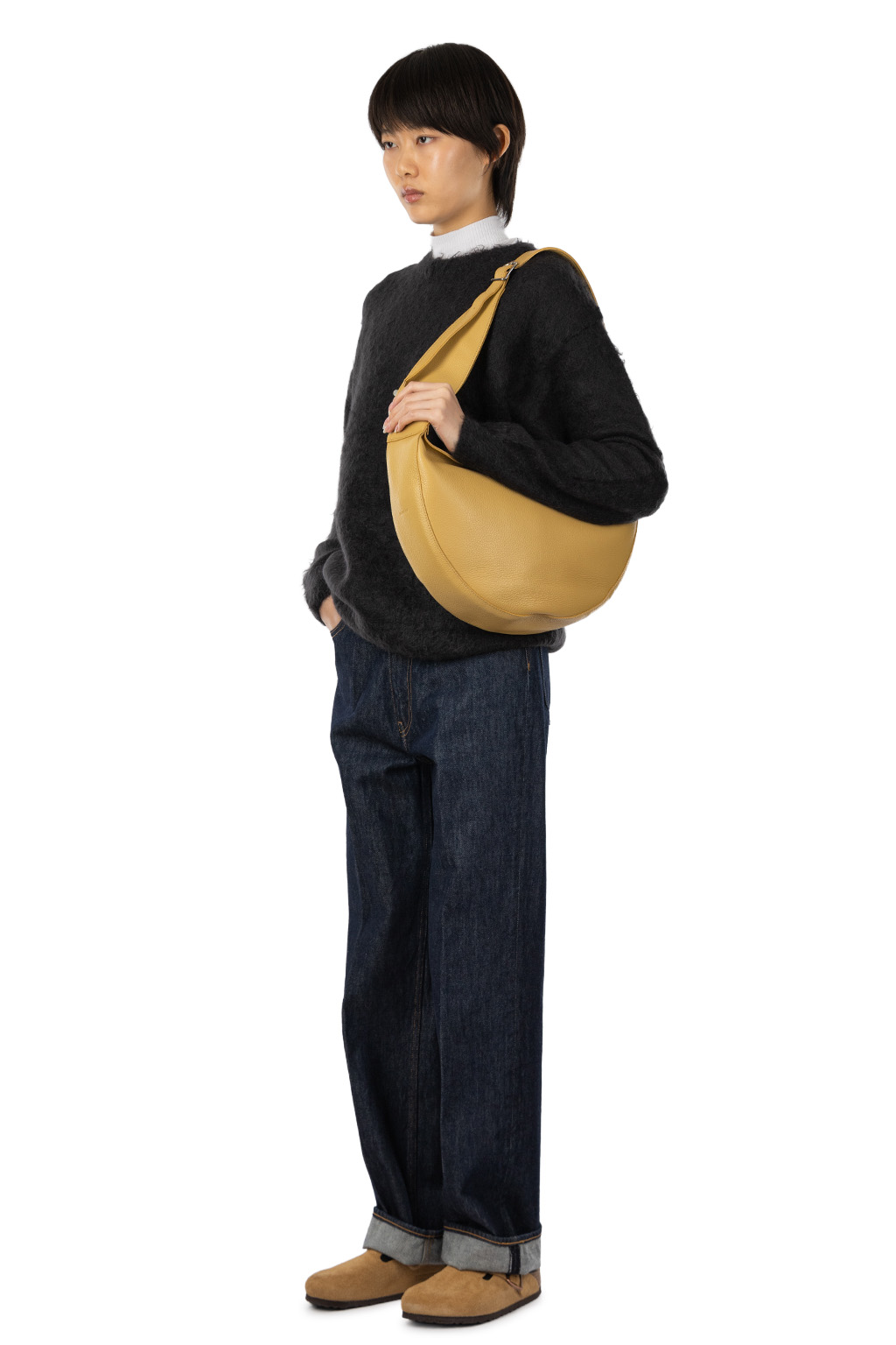 An AURALEE Autumn Winter staple, mohair knit crafted from soft Super Kid Mohair, spun into a gentle twist, with a core yarn made of soft natural wool. The result is a luxuriously fluffy knit that exudes warmth and lightness. Featuring a smooth, silky feel and the distinctive lustrous sheen of mohair, it also boasts a voluminous texture with long, flowing fibers that add depth and richness.